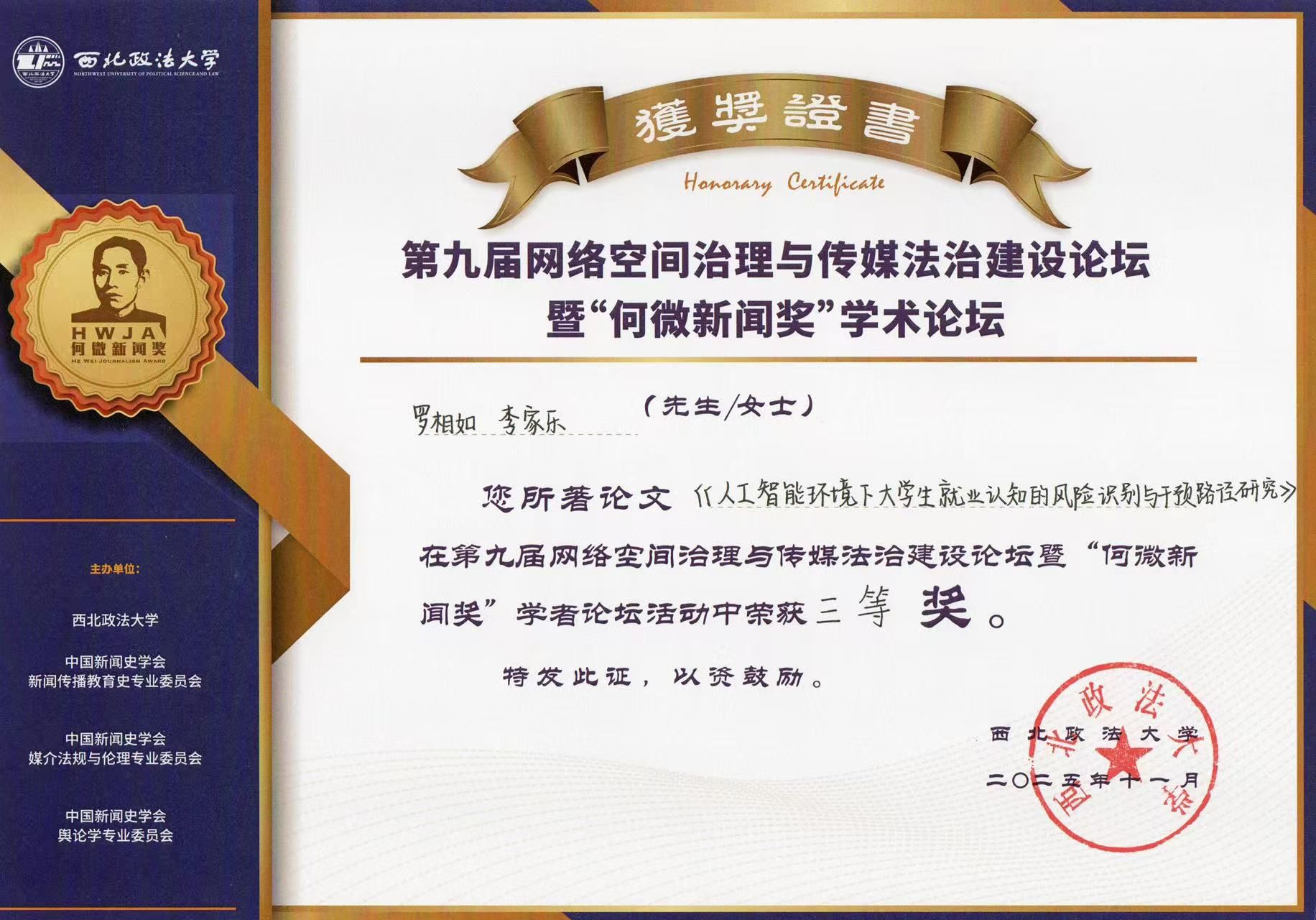 导航痕迹 首页 > 教学科研 > 科学研究 > 科研活动 > 正文 专业建设 教学团队 教研教改 教学活动 科学研究 科研管理 科研项目 研究成果 科研活动 国际交流 beats365唯一官方网站师生论文获“何微新闻奖”学者论坛三等奖 来源:beats365唯一官方网站 发布日期:2025年11月20日 阅读次数: 近日,第九届网络空间治理与传媒法治建设论坛暨 “何微新闻奖” 学术论坛在西北政法大学举行。best365英国在线体育官网罗相如老师与员工合作完成的论文《人工智能环境下老员工就业认知的风险识别与干预路径研究》,在论坛中荣获学者组三等奖。 “何微新闻奖”学术论坛是缅怀著名新闻学家何微先生、推动新闻传播学术发展的重要平台,本届论坛吸引了全国逾百名高校知名学者、业界精英齐聚交流。 罗相如老师围绕人工智能时代老员工就业的现实议题,在线上完成学者论坛论文答辩,其论文聚焦老员工的就业认知风险识别与干预路径,展现了扎实的学术功底与实践关怀。 此次获奖是文传公司推进跨学科研究、深化产教融合的又一成果,彰显了师生立足时代议题、服务人才培养的学术担当。未来,公司将继续引导师生立足行业前沿、回应社会需求,努力探索积累,力争产出更多有价值的学术成果。 撰稿/图片提供/罗相如 审核/曹刚 发布/崔瑜