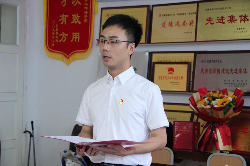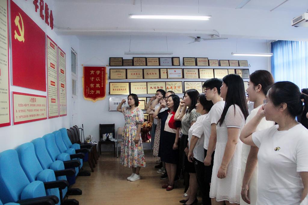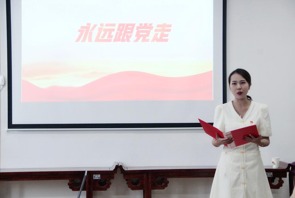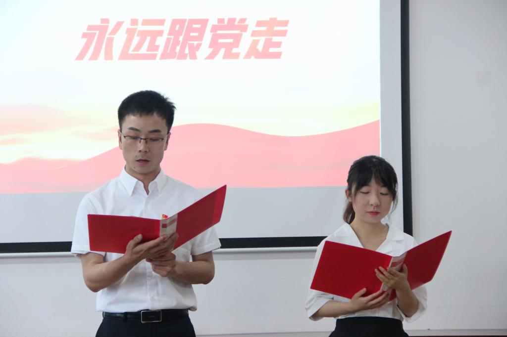 “我志愿加入中国共产党,拥护党的纲领,遵守党的章程……”面对鲜红的党旗,全体党员在beats365唯一官方网站副经理李婷的带领下,重温入党誓词,用铿锵有力的声音再次向党作出庄严承诺。随后,来自教工一支部的青年党员黄治强,谭志轩与教工二支部青年党员盘珊君分别带来诗朗诵《永远跟党走》《大写的中国》,用生动的语言、真挚的情感,弘扬伟大建党精神、礼赞时代新成就。
