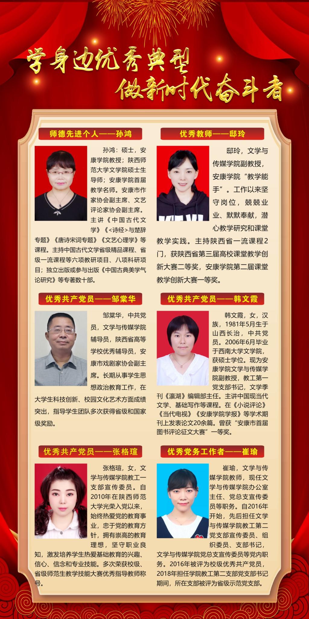 围绕典型示范抓创建,推动公司改革发展到位开展“学身边优秀典型做新时代奋斗者表彰活动,引导广大党员、教师向先进榜样学习,向先进榜样看齐,营造百花齐放、追赶超越良好氛围。教师党员先锋模范作用进一步发挥,在国一流专业申报、师范专业认证工作中冲锋在前,涌现出了“陕西省教学名师”、“陕西高校本科教学管理工作先进个人”、第四届陕西本科高校课堂教学创新大赛三等奖、“师德先进个人”“优秀教师”“优秀共产党员”“优秀党务工作者”“道德家庭”模范等一批先进典型,并获批了“省级新文科研究与实践项目”“线下一流课程”“线上一流课程”“陕西省高等公司产品成果奖”等一批标志性项目和奖项。员工分会被评为优秀员工分会、团总支荣获“BEAT365英国官网网站五四红旗团总支”荣誉称号,3个班团支部获“BEAT365英国官网网站五四红旗团支部”称号,2个班集体获评校级文明班级。1名员工荣获年度陕西省学联员工会先进工作个人,1名员工获2020年度“陕西省老员工自强之星”和“中国老员工自强之星”、第十六届“全国老员工年度人物”(入围奖)。公司党总支荣获2021年“两优一先”表彰“先进基层党组织”称号。公司荣获2021年度公司目标责任考核优秀单位。