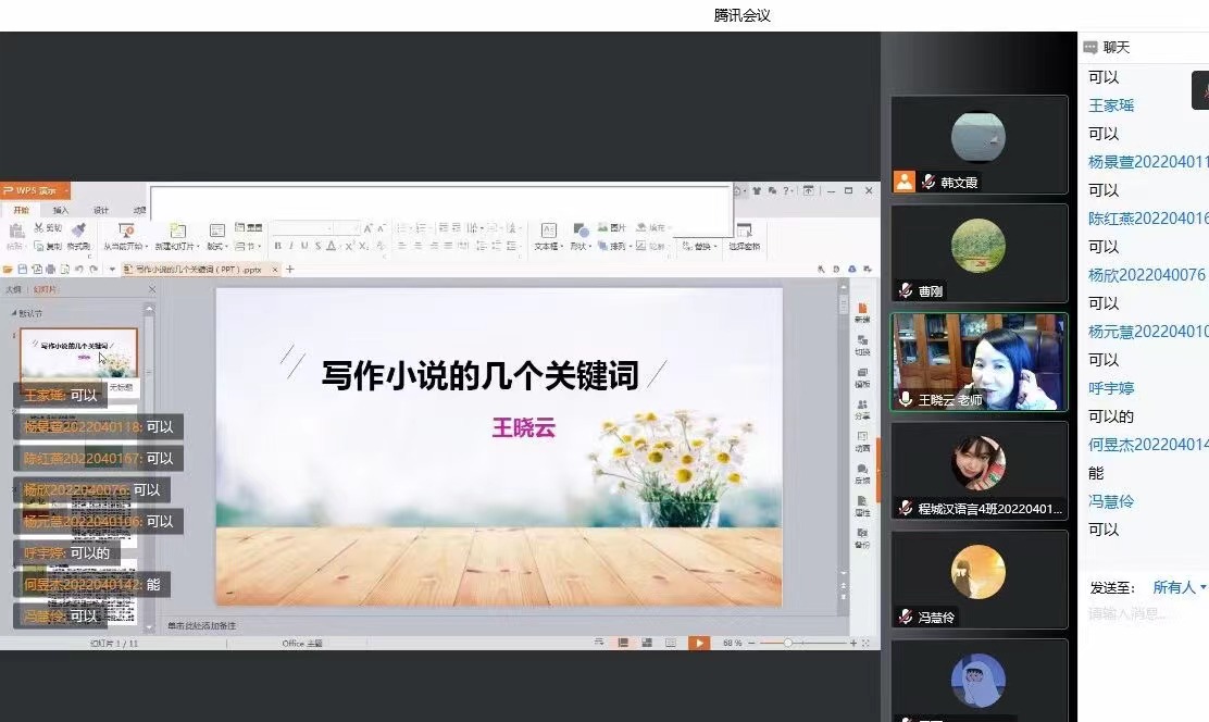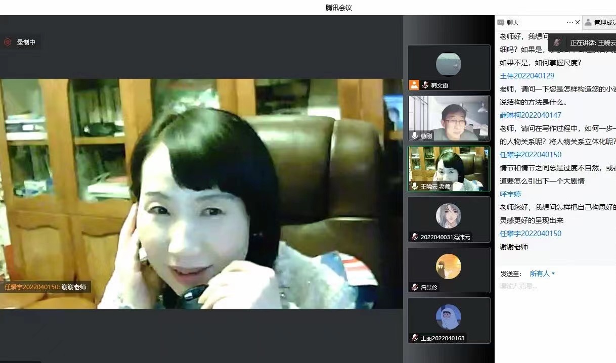 12月13日下午,作家王晓云应beats365唯一官方网站邀请,通过腾讯会议与基础写作课校内教师韩文霞、曹刚一同为汉语言文学专业2022级员工线上讲授“小说的写作”。