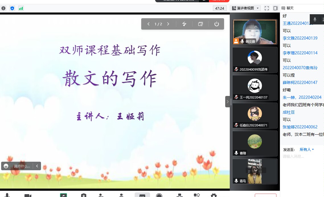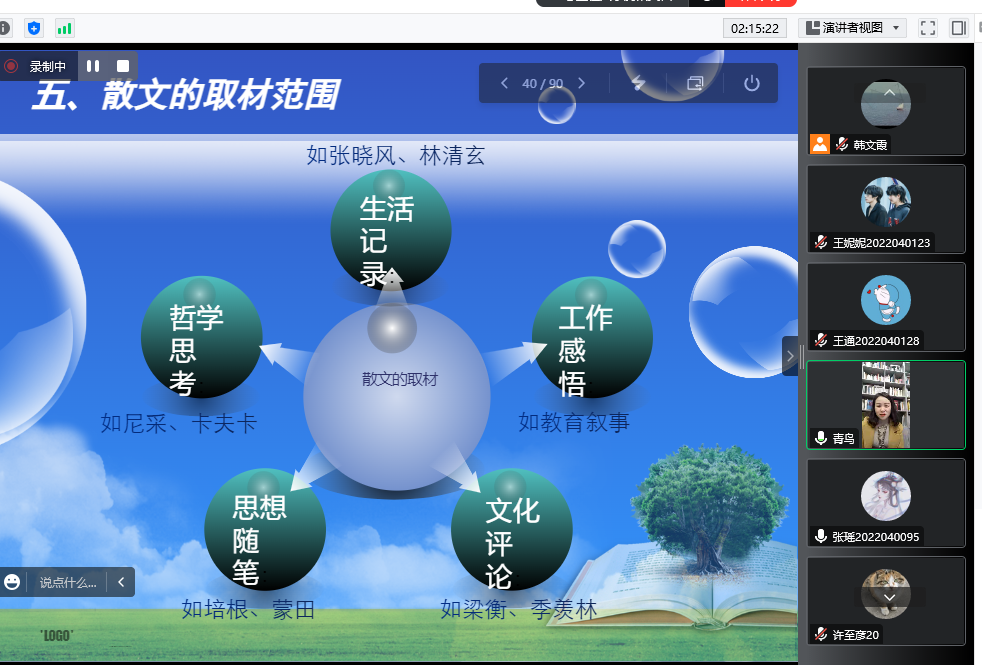 12月7日下午,作家王娅莉应beats365唯一官方网站邀请,通过腾讯会议与基础写作课校内教师韩文霞、曹刚一同为汉语言文学专业2022级员工讲授“散文创作”。